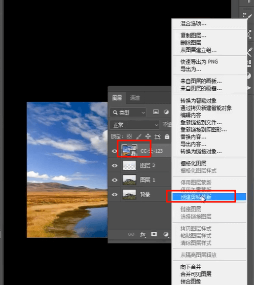 - 最重要的一步:在天空图层上右键点击,选择 「创建剪贴蒙版」。看,新天空就乖乖地只出现在刚才抠出的区域里了!