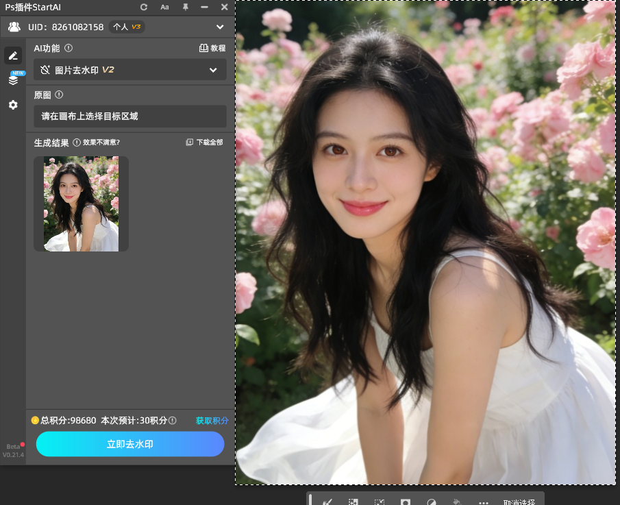 操作技巧:无需精准抠选水印边缘,大致圈选即可,工具会智能识别并融合背景。