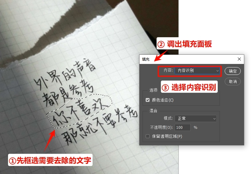 方法一:简单背景(比如纯色、渐变的背景):使用“矩形选框工具”或者“套索工具”,圈选需要删除的文字区域,然后执行“编辑-填充”,在弹出的窗口中选择“内容识别”,点击确定,PS会自动识别背景纹理,填充去除原文字,几乎无痕。