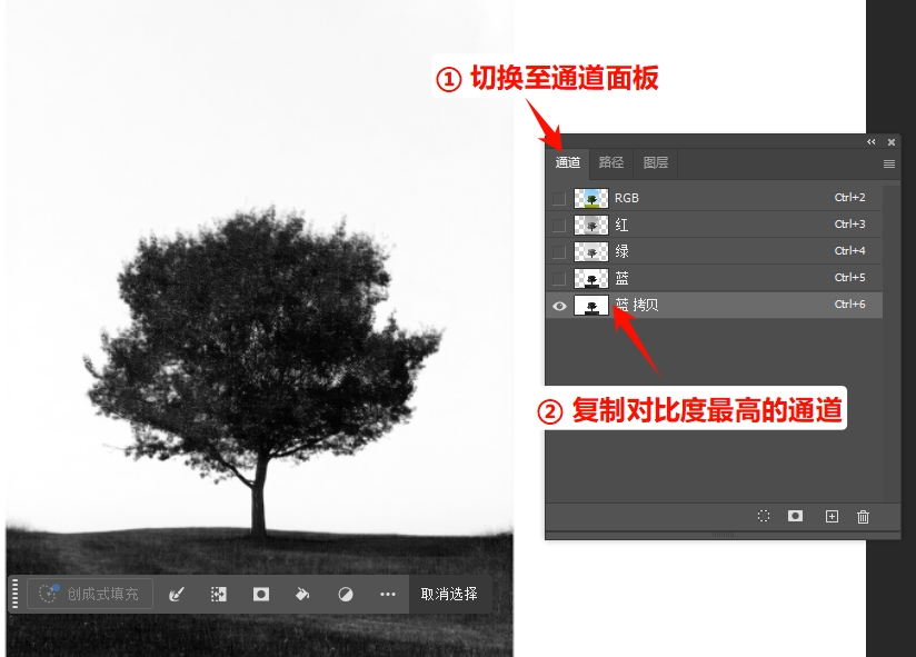 ⑤ 按住【Ctrl】键,点击通道副本的缩略图,生成选区(此时选中的是主体区域)。