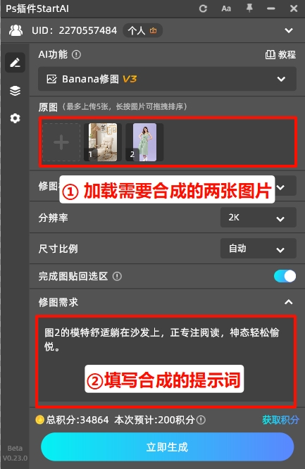 找到PS右侧的StartAI插件面板,打开后找到「Banana修图」功能,然后点击插件中的“+”号,上传刚才导入的两张照片,在提示词输入框中,简单描述拼接需求,例如:“图2的模特舒适躺在沙发上,正专注阅读,神态轻松愉悦”