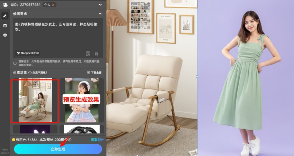 点击「立即生成」按钮,等待10-30秒,AI就会自动完成拼接,不仅会无缝衔接两张照片的边缘,还会自动匹配两张照片的色彩、光影,修正分辨率差异,彻底解决PS原生溶图的所有痛点。