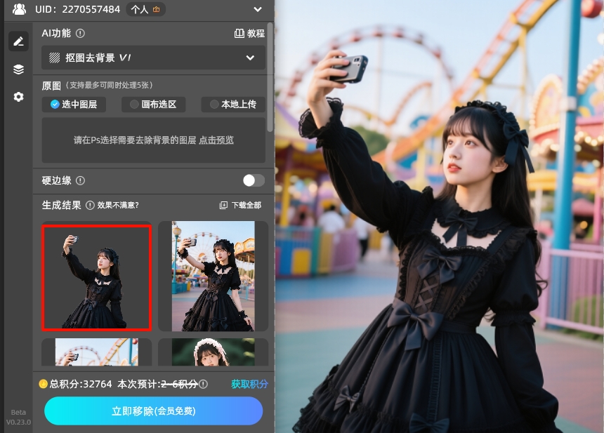 ③ 选中需要抠图的图层,点击插件中的“立即生成”按钮,AI会自动识别主体与背景,无需手动选区、无需调整参数,等待3-5秒,即可完成抠图,自动保留发丝、绒毛、透明物体等细微边缘,直接生成透明背景。