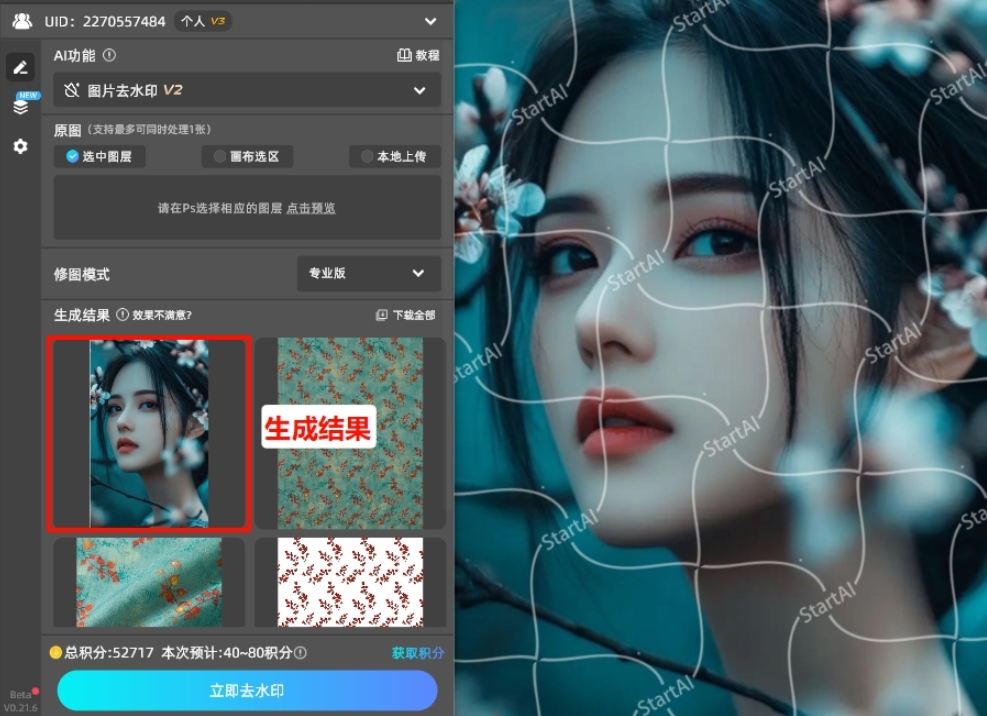 PS方法如果操作不当(比如画笔硬度太高、反复涂抹),会破坏画质;StartAI插件采用AI智能填充,不生硬覆盖水印,而是匹配原图像素,画质零损伤,放大看也和原图一致。