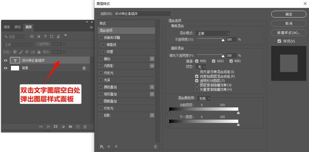 2. 双击文字图层的空白处(注意不要点文字区域),弹出图层样式窗口后,勾选左侧的「投影」选项,此时文字会自动出现基础阴影效果;