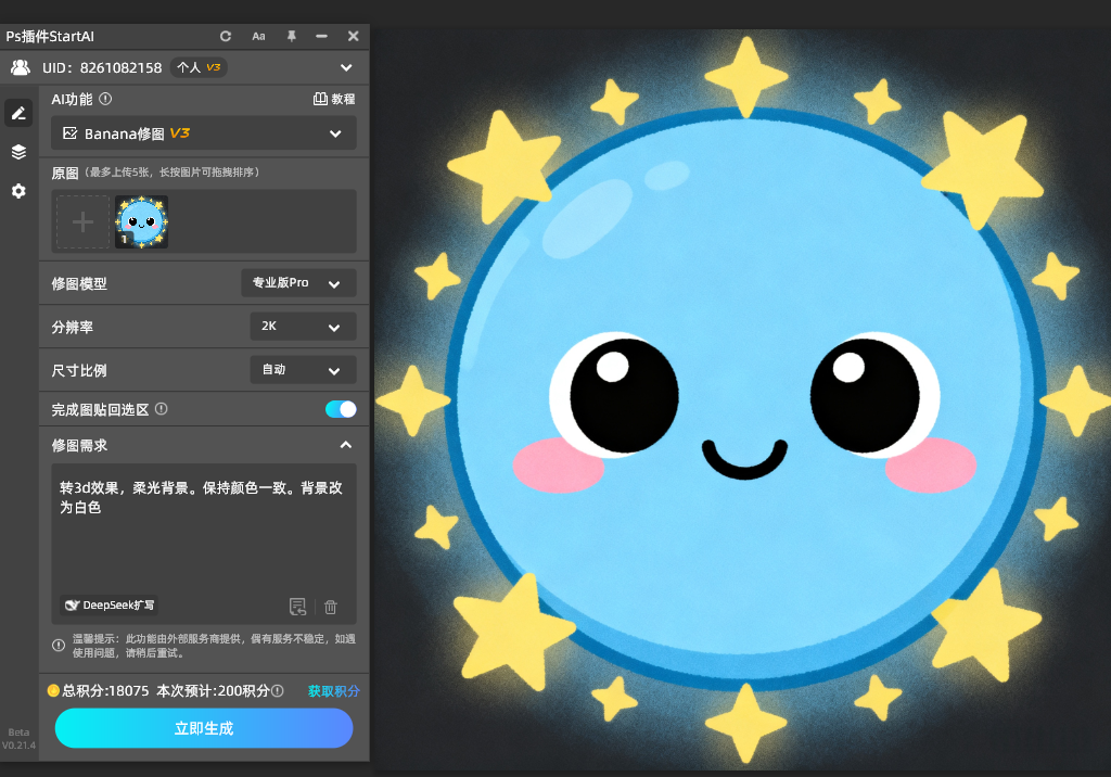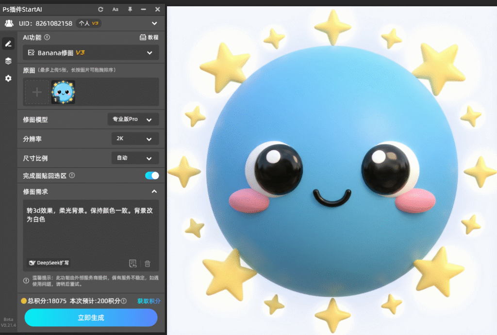 - 在提示词输入框中填写 “转 3D 效果,柔光背景,保持颜色一致”,若有额外需求(如调整光影强度、强化某类细节),可补充相关描述;