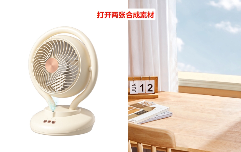 (3)点击“+”上传两张需要融合的图片,在下方的提示词输入框中,简单描述融合需求,例如:“把图1的风扇放到图2的桌面上”,无需复杂描述,AI能精准识别需求;