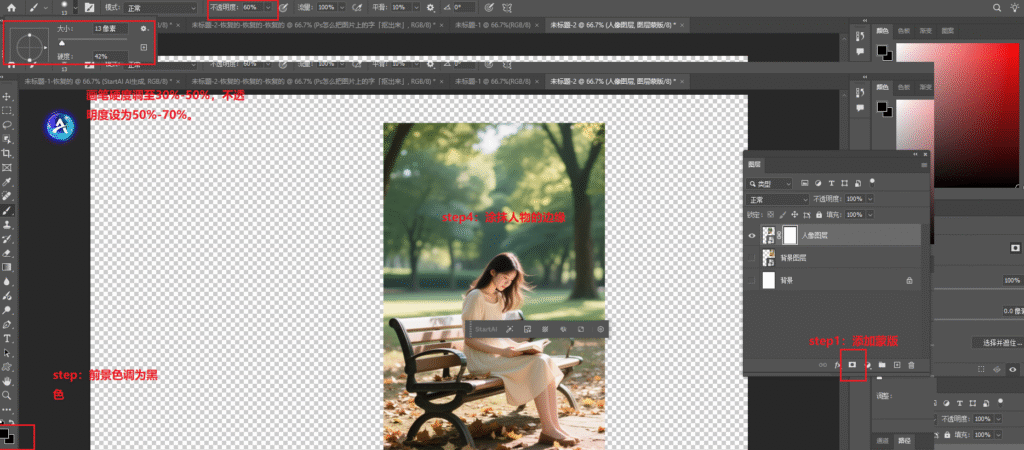选中人物图层,点击图层面板底部的“添加图层蒙版”按钮、,此时人物图层右侧会出现白色蒙版。选择左侧工具栏的“画笔工具”,将前景色设为黑色,画笔硬度调至30%-50%,不透明度设为50%-70%。