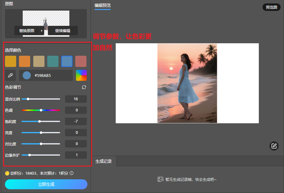 3、AI自动换色:进入色彩调节,调节色彩的参数,让颜色自然贴合。