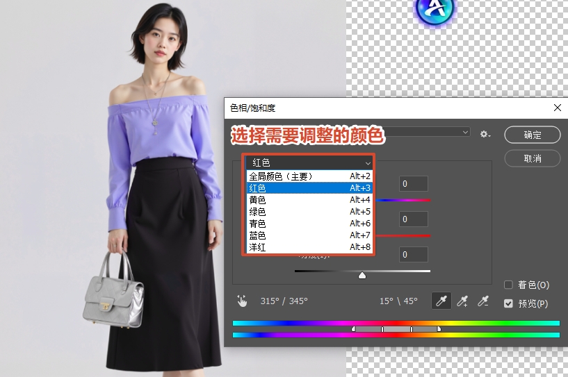 (3)如果像修改局部颜色:取消勾选「着色」选项,先选择目标颜色(通过面板下拉菜单选择对应色系),再调整色相、饱和度和明度,同时可结合图层蒙版,涂抹需要改色的区域,实现精准局部改色。