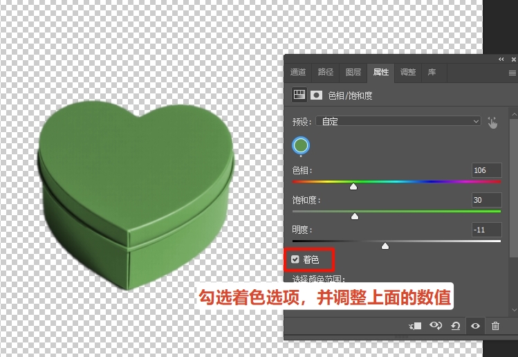 2. 在弹出的属性面板中,勾选右上角的「着色」选项;