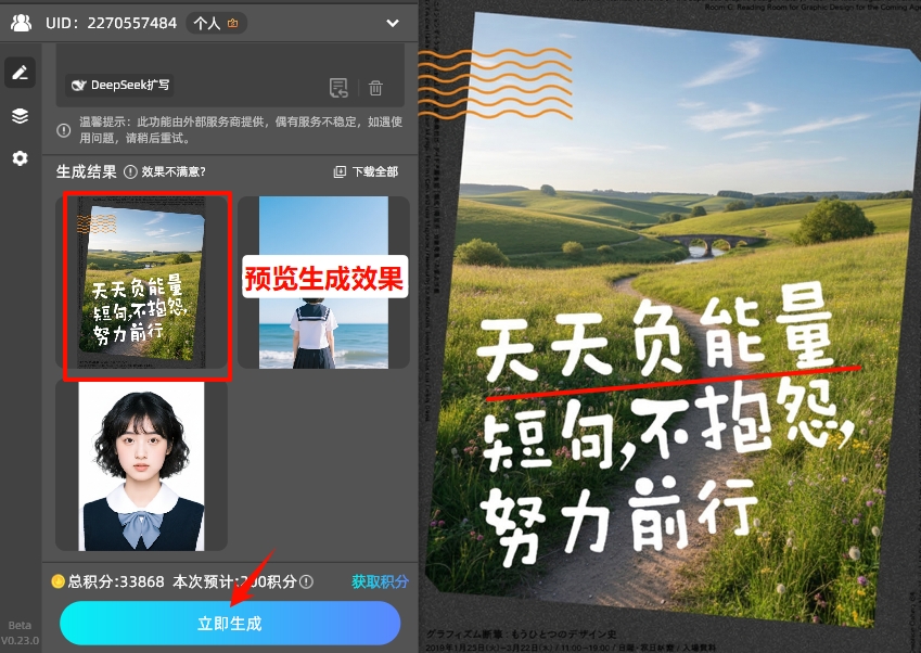 一键生成效果:点击“立即生成”按钮,等待10-20秒,插件就会自动完成文字替换,同时修复背景,实现无痕融合,哪怕是复杂纹理背景,也能做到和原图质感一致;