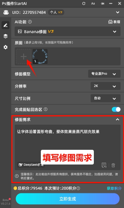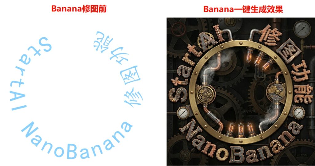 在Banana修图面板,加载文字图层,然后填写“修图需求”,例如:“让字体沿着圆形弯曲,整体效果是蒸汽朋克效果”,这个提示词可以填写多种效果,只要你能想的到的都可以直接生成。