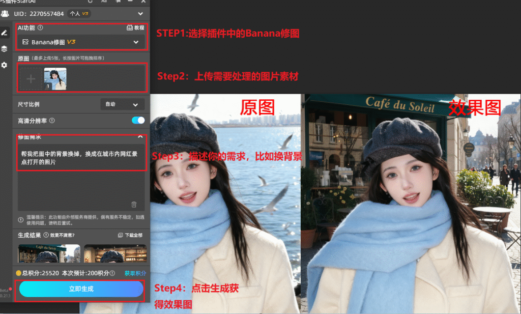 第二步:在StartAI插件面板中切换至“banana修图”模块,在面板中获取需要处理的图片,在修图需求中描述你要换成什么样的背景。