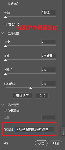 5、输出:在“输出到”中选择“新建带有图层蒙版的图层”,完成。