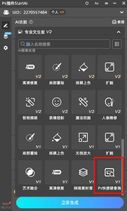 针对新手记混快捷键、老手临时遗忘进阶组合键的问题,StartAI 内置全量PS快捷键查询功能,支持一键搜索。设计时无需切换浏览器查手册,直接在插件面板调取,彻底告别死记硬背,让自由变换等操作衔接更流畅。