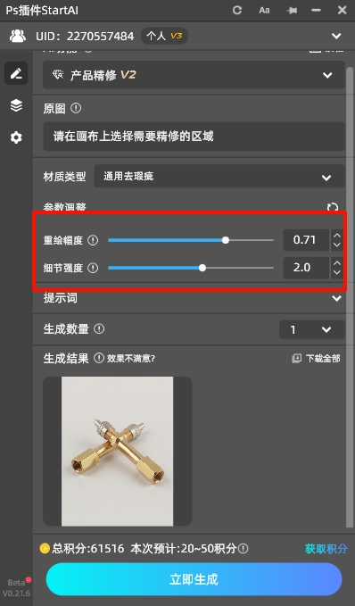 点击StartAI图标,在插件的功能面板选择“产品精修”,在下拉菜单中“材质类型”选择通用去瑕疵,调整重绘幅度和细节强度,如果金属物品的瑕疵比较多,可以拉大重绘幅度,能获得更好的效果。