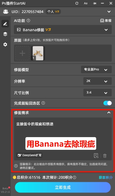 参数设置完成后,用PS的选框工具(快捷键M),框选需要精修的五金产品区域,尽量贴合产品轮廓,避免框选过多背景。框选完成后,点击插件右下角的“立即生成”,等待10-20秒,AI就会自动完成精修。