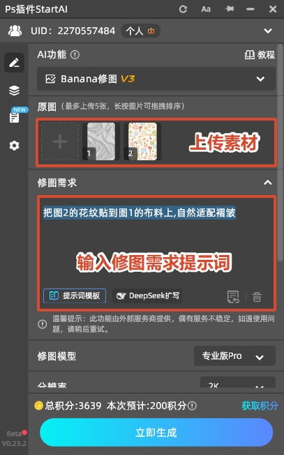 ② 在Banana修图面板,点击上方的“+”上传物品和需要贴图的印花素材,然后在修图需求填写对应的提示词,例如“把图2的花纹贴到图1的布料上,自然适配褶皱”