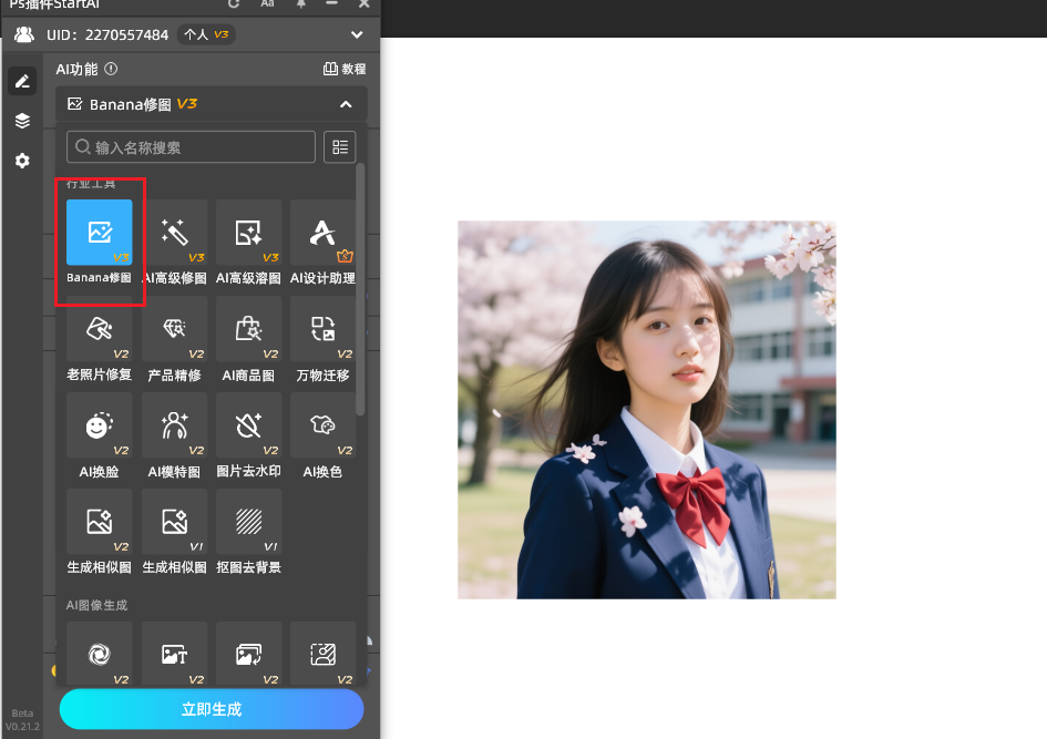 1、在PS导入需要处理的图片,打开StartAI面板,找到Banana修图功能。