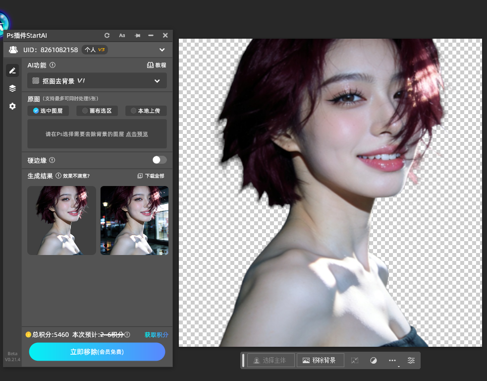 - 打开插件,选择「抠图去背景」,选区上传后点击生成;