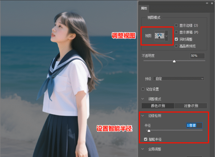 (3)在右侧面板勾选【智能半径】,根据毛发浓密程度调整数值(人像发丝设2-5px,动物绒毛设5-8px),软件会自动识别边缘细节;再用左侧“调整边缘画笔”,在发丝区域轻轻涂抹,抓取细碎毛发。