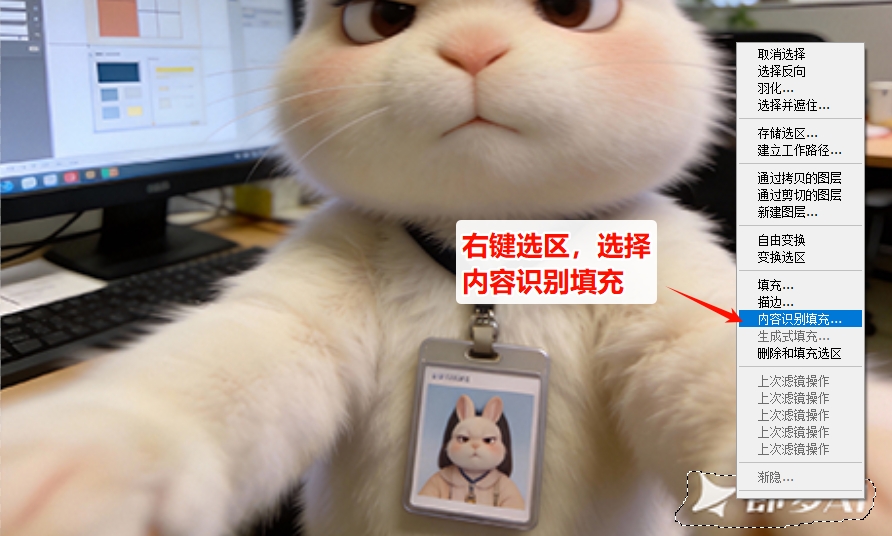 2. 选中选区后,右键点击选区,选择“内容识别填充”,打开专用的内容识别填充工作区。