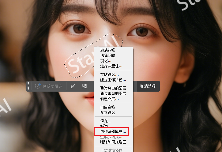 ③ 右键选区弹出菜单,在菜单中选择”内容识别填充”,点击确定;