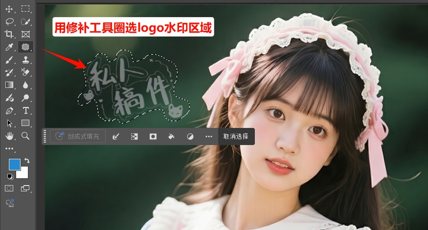 2. 用「套索工具」框选半透明logo水印区域,选区范围比水印一点就可以;