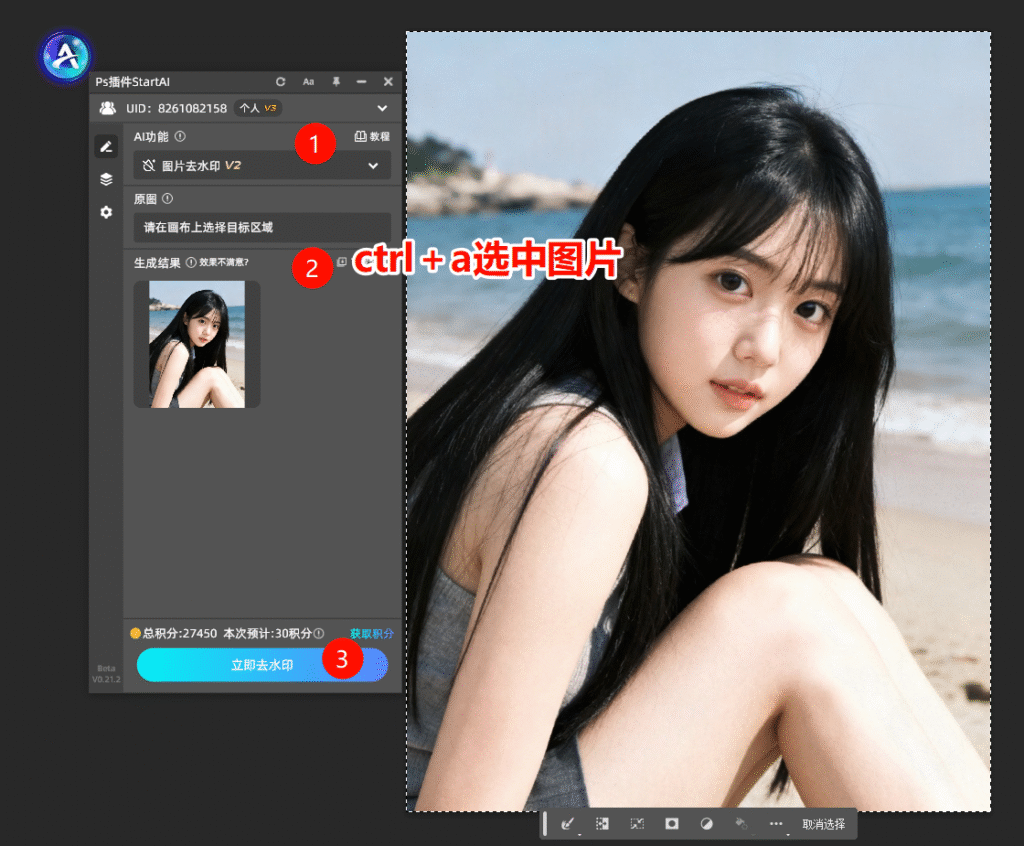 - 框选全图:PS 打开图片,启动 startai 插件,不用精准找水印,直接框选整个图片就行(AI 会自己识别)