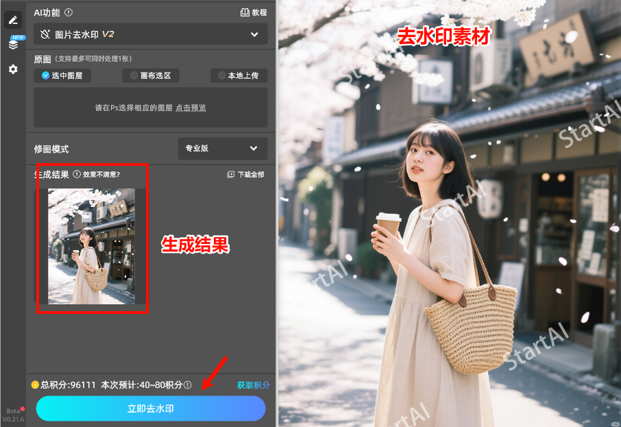 总结:如果是偶尔处理简单水印,掌握PS基础去水印方法即可;但如果经常需要去水印、追求高效无痕效果,或面对批量处理需求,StartAI插件绝对是最优选择,让PS去水印从“耗时费力的技术活”变成“举手之劳的简单操作”。