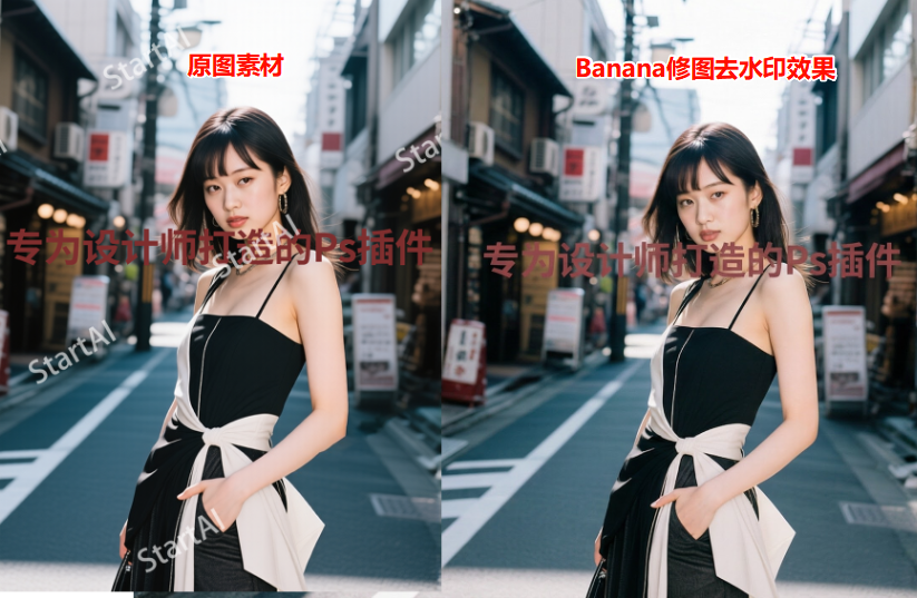 • 全场景适配:各种文字水印都能搞定:无论是半透明水印、透视水印,还是复杂背景下的文字水印,StartAI都能精准处理,适配度远超PS原生方法;