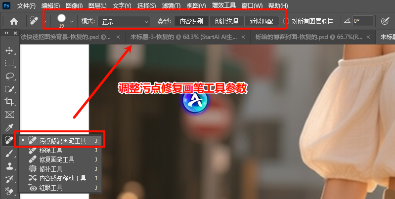对比维度原生PS去水印方法StartAI插件去水印