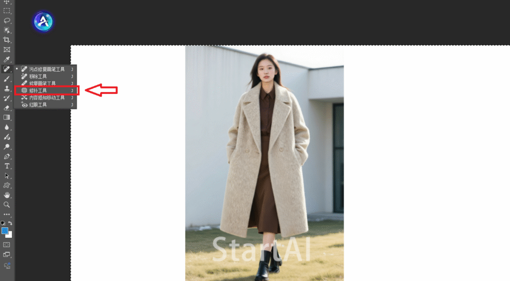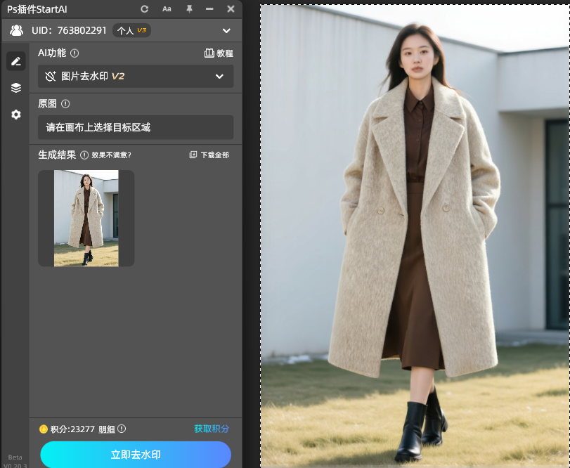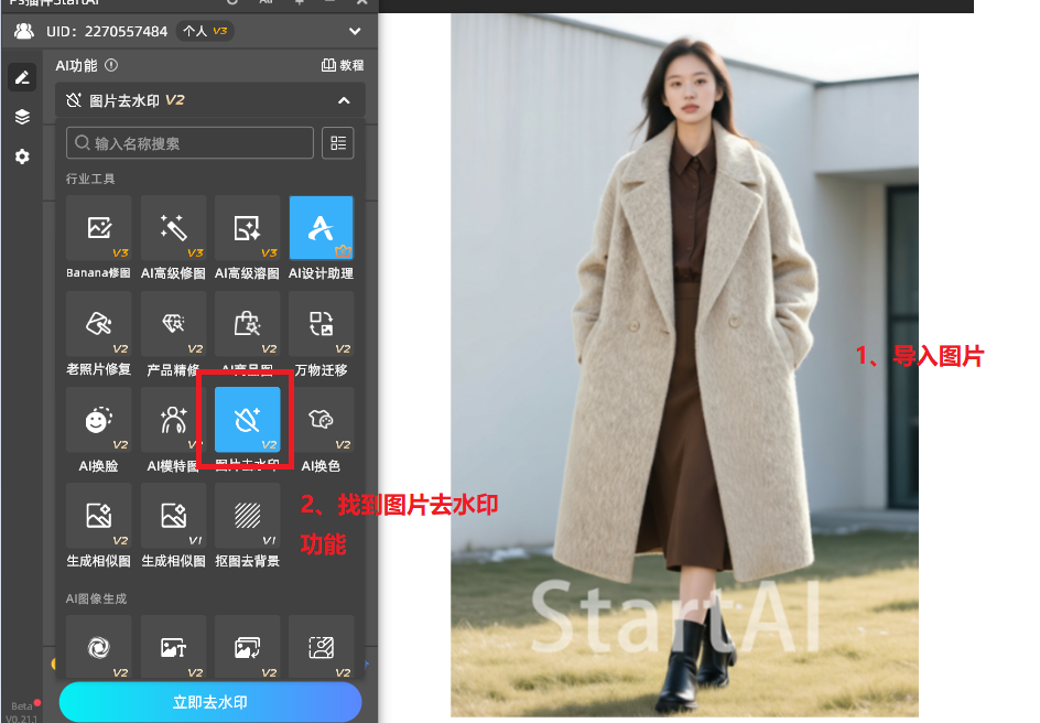 1. 导入原图:将需要处理的水印图片导入到PS,并且找到StartAI中“图片去水印”的功能。