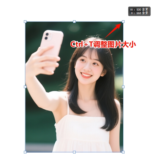 2、按下快捷键 Ctrl+T 调出自由变换框,拖动框的角点进行缩放时,一定要按住 Shift 键,才能维持图片的宽高比例,防止出现拉伸变形;