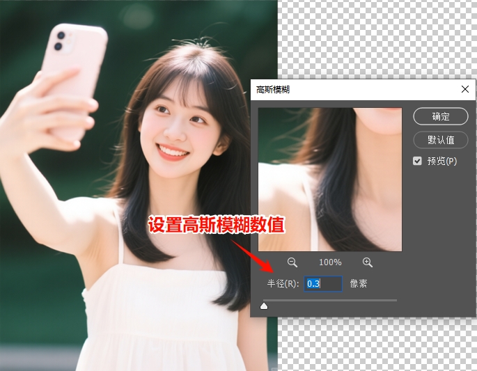 2、选中复制后的图层,在顶部菜单选择「滤镜」→「模糊」→「高斯模糊」,将半径设置为 0.3-0.6 像素,让放大后的过渡更自然;
