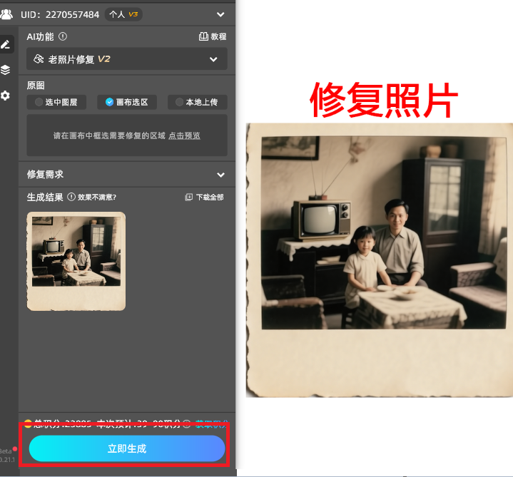 第三步:点击立即生成,即可获得我们修复完成的照片。