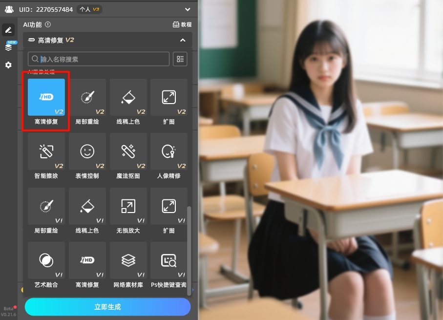 ③ 点击“立即生成”,等待10-20秒,插件会通过AI算法智能识别模糊类型,自动补充照片细节,生成完成后,会自动新增一个高清修复图层,隐藏原始图层,就能看到清晰化后的效果。