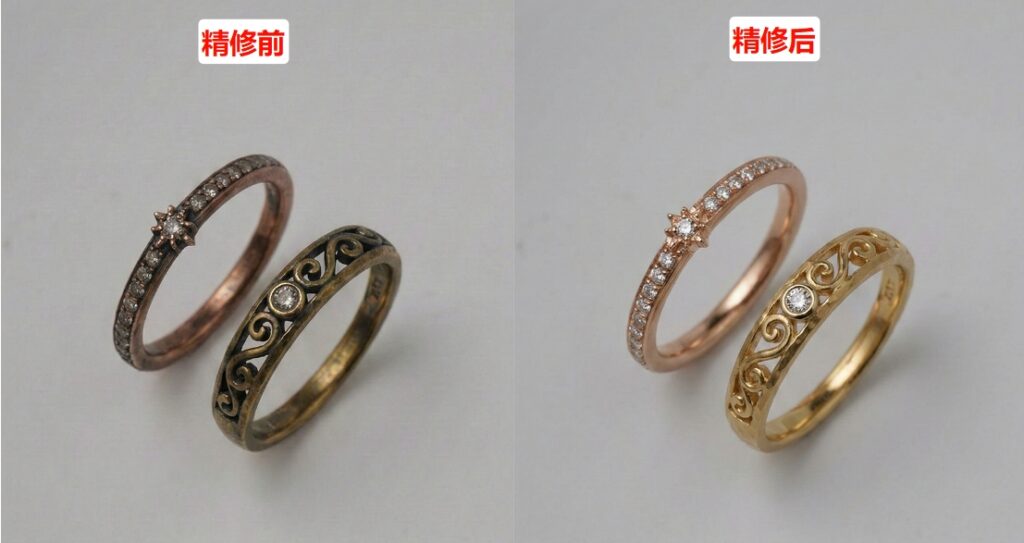 通用模板:“首饰精细精修,去除表面划痕、瑕疵和灰尘,优化光影层次,还原材质本身质感,背景干净纯白,无多余杂物,高光自然,阴影柔和,适合电商主图使用,细节清晰可见”;