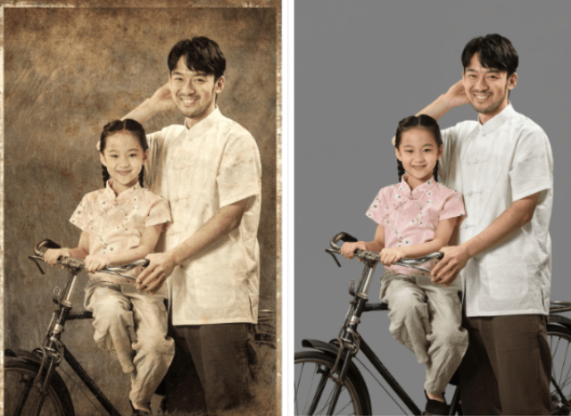 - 功能介绍:AI自动消除老照片上的划痕、折痕、磨损、污渍等瑕疵。