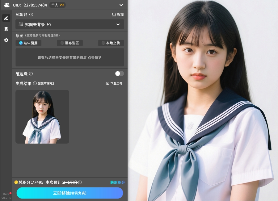 2. 选中抠图的图层,点击插件中的“立即生成”按钮,此时AI会自动识别图片中的主体,等待3-5秒,插件会自动完成抠图,去除背景,主体边缘干净利落,发丝、毛绒等细节都会完整保留,不用手动修边;