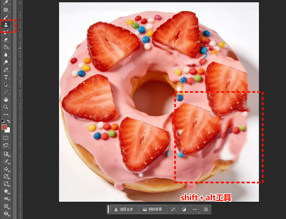 - 按住键盘「Alt 键」,鼠标移动到图片中 “完好的部分”(比如甜甜圈完整的另一半),点击一下选中参考区域(此时鼠标会变成十字形,代表成功取样);