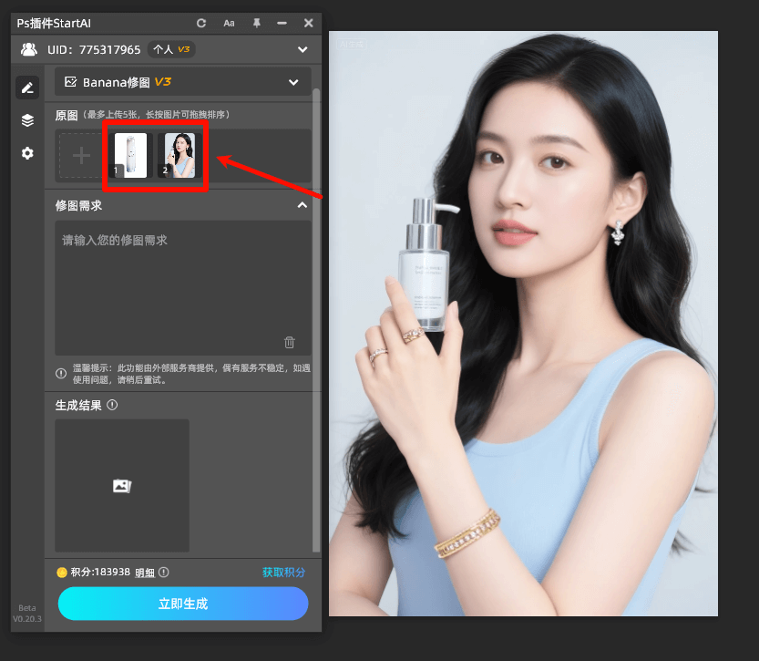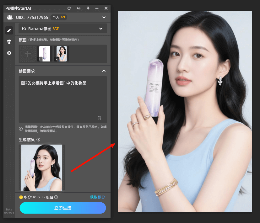 第二步,填写提示词,清晰说明产品迁移替换的要求,比如 “图 2 的女模特手上拿着图 1 中的化妆品”;