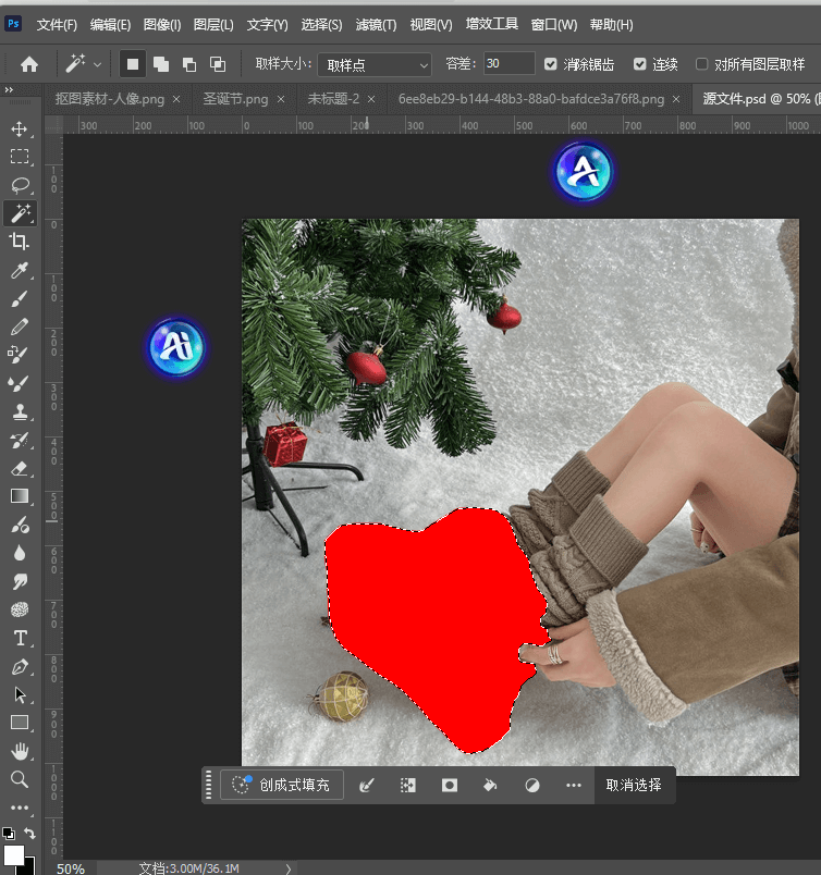 - 使用Photoshop的选区工具(如快速选择工具)粗略选中模特的脚部区域,快速填充红色,这将帮助AI更准确地定位。