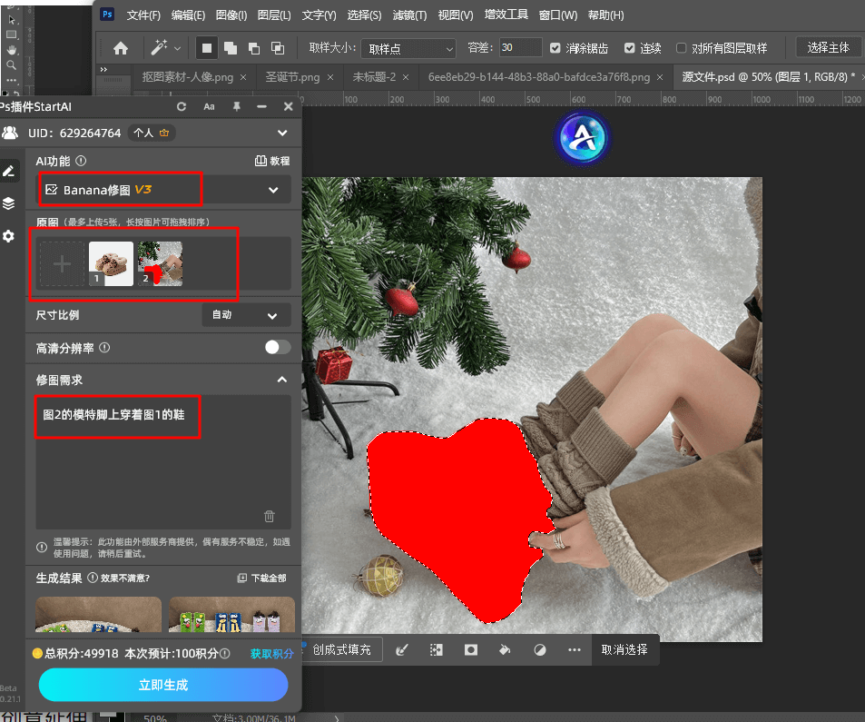 我们将使用StartAI插件的banana修图功能,为模特换上理想的雪地靴。