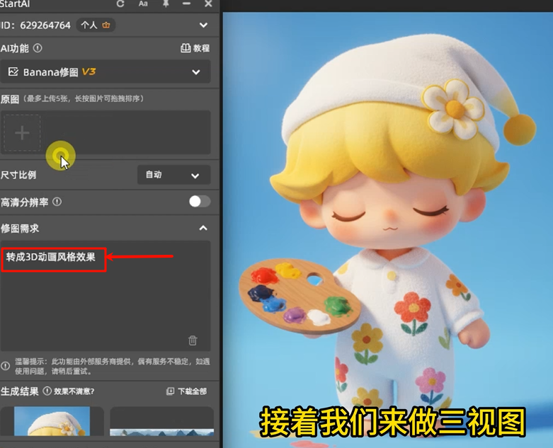简单到爆!把你画好的IP原图拖进PS里,打开StartAI插件,选那个banana修图功能输入你想要的效果,比如“转成3D动画风格”,点击生成,等个几分钟,一个完整的3D模型就出来了!