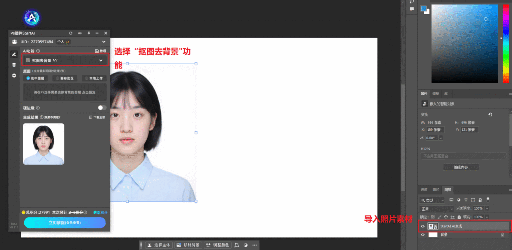 按Ctrl+O导入一寸照片,点击“StartAI”面板,在插件面板中选择“抠图去背景”功能(部分版本显示为“证件照优化”),插件会自动识别图片中的人物主体,无需手动框选。