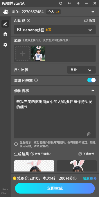 ③ 在Banana修图面板中,在“原图”加载我们需要处理的图片,在提示词里面需要处理的功能,处理头发丝我写的提示词为“帮我完美的抠出画面中的人物,要注意保持头发的细节”,直接点击面板中的“立即生成”按钮,工具会在5-20秒内完成抠图。