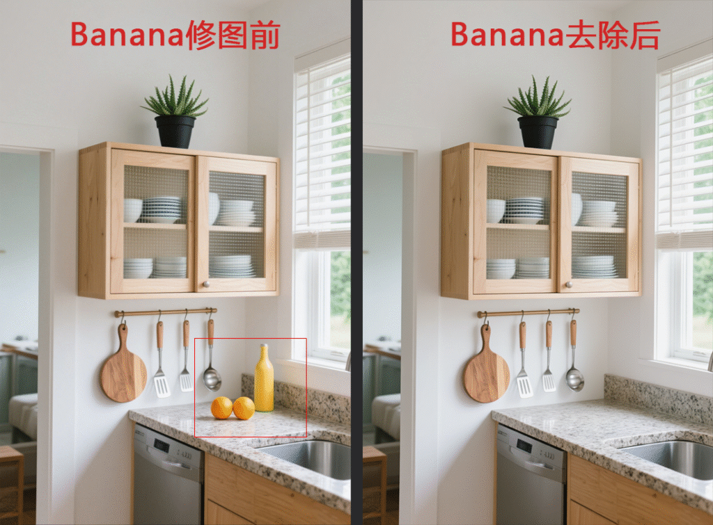 在StartAI的Banana修图功能面板上,在“原图”区域添加我们需要处理的素材,在“修图需求”中准确的描述我们需要去除的东西是什么,例如我这边输入的是【帮我把其中黄色的瓶子和橙子的橘子去除】。